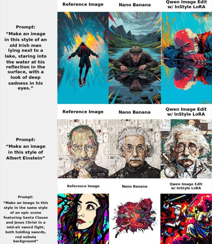 - Qwen Edit (with InStyle LoRA): Open-source friendly. Users can train task-specific LoRAs, enabling more precise style transfers, inpainting, and image editing.