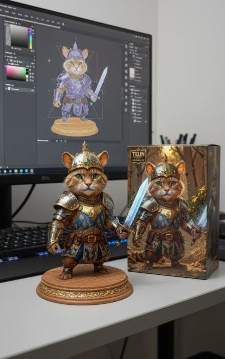 “Generate a 1/4 scale commercial figure of the character in the reference image, rendered in a realistic style and environment. Position the figure on a computer desk with a circular oak base featuring a gold accent, without any text. On the computer screen, show the Adobe Illustrator modeling process of the figure. Next to the screen, place a TEUN-style toy packaging box featuring the original character image.”