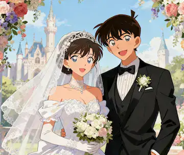 Memorable events are accompanied by anime-style group portraits. Weddings,